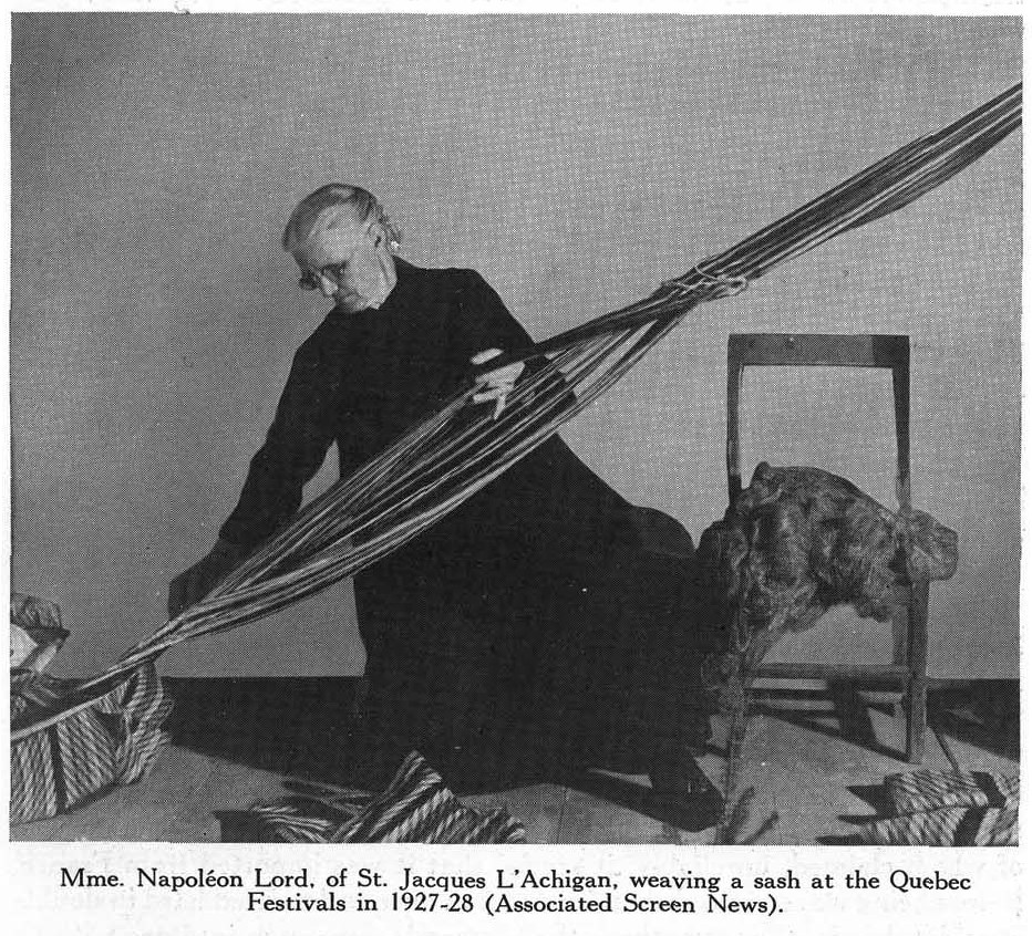 Marius Barbeau’s bulletin, “Assomption Sash” that he authored for the Ottawa: Dept. of Mines, National Museum of Canada is valuable resource for anyone interested in the origins of the arrow sash. It is obvious that extensive research and original interviews were used to prepare this bulletin. A copy of this bulletin can be downloaded from the following url https://www.historymuseum.ca/cmc/exhibitions/tresors/barbeau/mbp0504e.html The bulletin is divided into parts; each part is a pdf file that can be downloaded. Barbeau acknowledges that there are different styles of fingerweaving and different grades of sashes. However, Barbeau makes no effort too explain the differences. He also acknowledges that the amount time required to produce a sash changed. On page 29, Barbeau states “Not a few people, it seems. could make an ordinary sash in a long day”. On page 30, he states “ Now a weaver would not think of making more than a few inches a day. In a Montreal census' for 1825 it is stated that 3 weeks were required by a weaver to make a sash”. Barbeau stops here, without making any attempt to explain the reason for this time difference. After reading the bulletin “Assomption Sash” numerous times I have concluded that Barbeau was not a fingerweaver, therefore he did not recognize that he was observing several very differrent styles of fingerweaving. However, Barbeau does include clues that can be used to explain this difference in the time required to complete a a sash. On page 29--30, “When the sash was of exceptional size and quality, more time was required. Mme. Napoléon Lord used to weave, in a day, 3 feet and 3 inches, that is, half of one sash”. On page 5 there is a photograph of Mme. Napoléon Lord. The photograph shows several sashes. The pattern of the weaving does not appear to be warpface fingerweaving but is more consistent with interlinked fingerweaving. To support this observation I have attempted to produce the pattern using warpface fingerweaving and interlinked fingerweaving. My attempts with warpface weaving were unsuccessful, but when I used interlinked fingerweaving, I was successful. The following photographs illustrate the results of my experiment. The black and white photograph is included to makes it easier to compare my work to the photograph on page 5 of Marius Barbeau’s bulletin. |