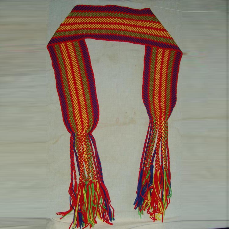 | I was able to weave the sash pictured in less then three days. This was in spite of the stiffness of my hands, which makes it impossible for me to work for more then two hours at a time. Marius Barbeau’s bulletin is the first primary source on the development of fingerweaving that I have found . The results of this experiment and Marius Barbeau’s bulletin has lead me to believe that interlinked woven sashes were the original sashes “common sash” used by the French Canadians and first sashes produced for the early fur trade. |