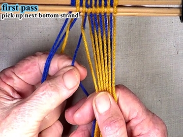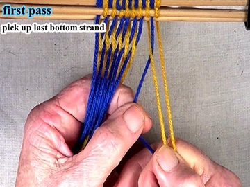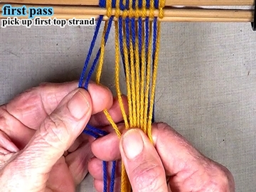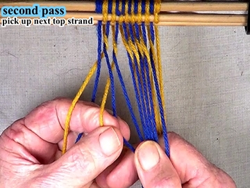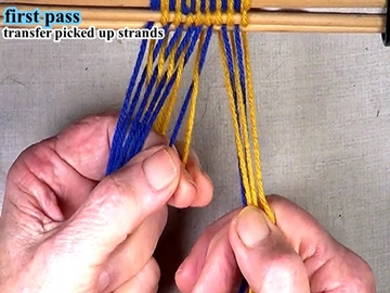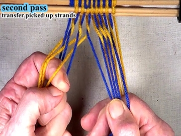 Transfer the picked up strands to the index finger of the left hand. [OBSERVE] The next two strands are in the top layer of the shed. |