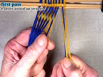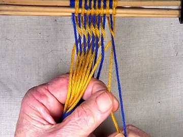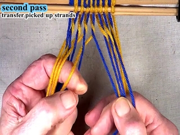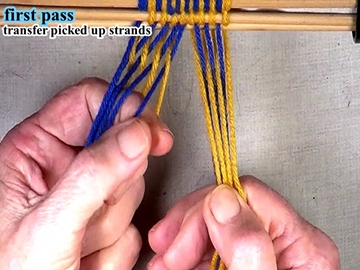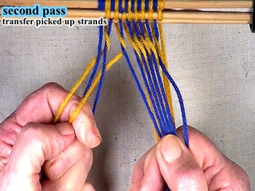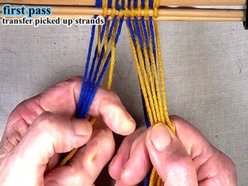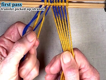 Transfer the picked up strands to the index finger of the left hand. [OBSERVE] The shed of the picked up strands has been reversed. |
