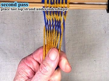 Place the last top shed layer strand under the left hand index finger. [OBSERVE] The shed has been reversed. |