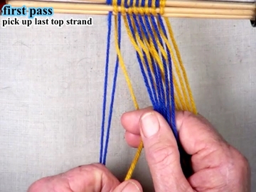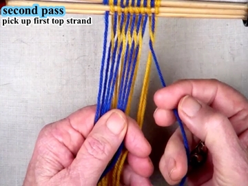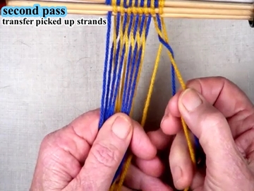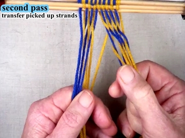 Use the index and second fingers of the right hand to pick up the next strand of the top shed layer.