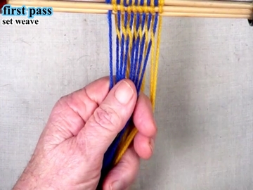 [OBSERVE] The first two strands on the left hand side are in the top shed layer ( over the index finger of the right hand).