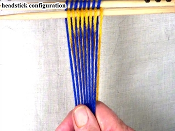 Headstick Set Up This part of the [Z] twist interlinked fingerweaving tutorial will be worked from the left hand side of the workpiece to the right hand side of the workpiece. The shed is picked up on the index finger of the right hand. The bottom layer of the shed is under the index finger. The top layer of the shed is over the index finger. [NOTE] The headstick is set up so that the first strand on the left hand side of the workpiece is in the bottom layer of the shed. |