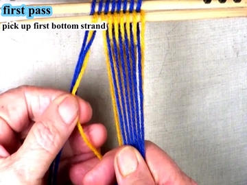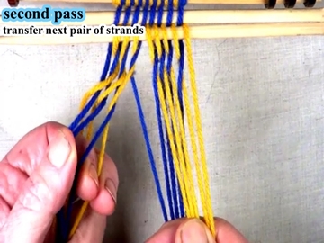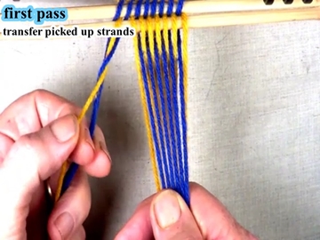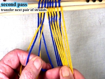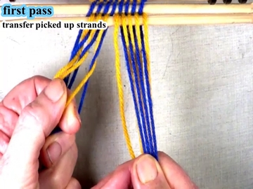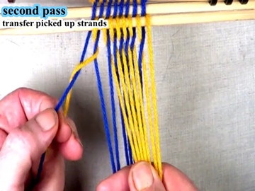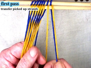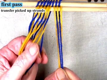 Transfer the picked up strands to the index finger of the left hand. [OBSERVE] The next two strands are in the bottom layer of the shed. |
