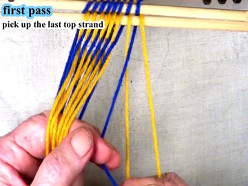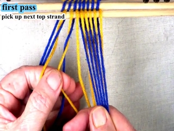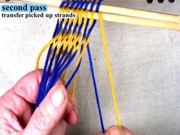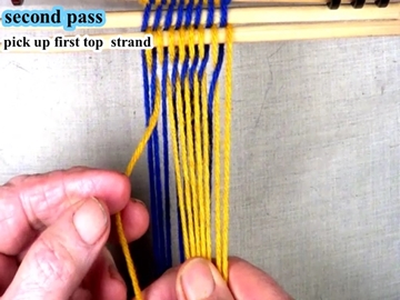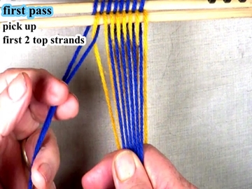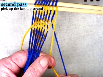 Use the index and second finger of the left hand to pick up the next strand of the top shed layer. |