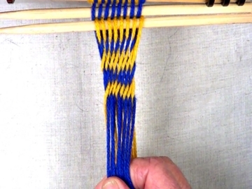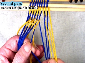 Place the last bottom layer strand over the index finger of the left hand. [OBSERVE] The configuration of the shed has been returned to the starting configuration. [OBSERVE] The over-2/under-2 configuration of the strands produced by the two different passes. |