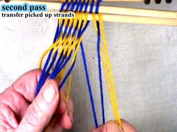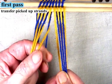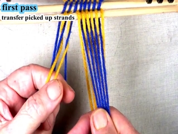 Transfer the picked up strands to the index finger of the left hand. [OBSERVE] The shed of the picked up strands has been reversed. [OBSERVE] The next two strands are in the bottom shed layer. |
