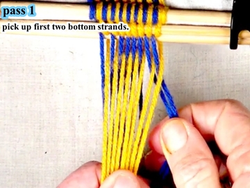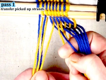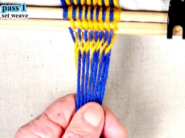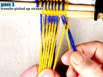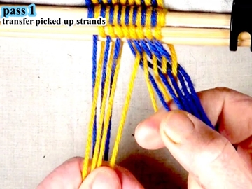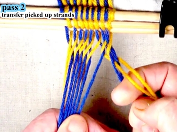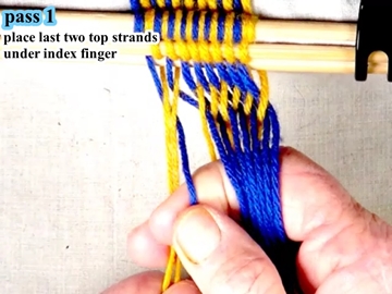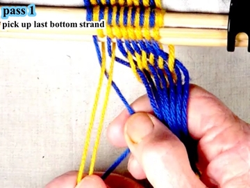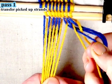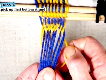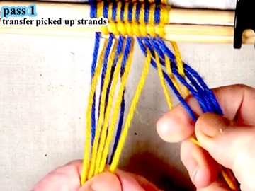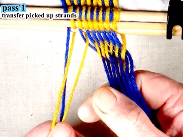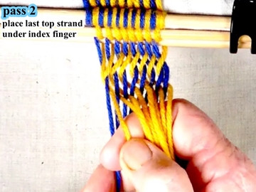[OBSERVE] The first two strands on the right hand side of the work piece are in the top layer of the shed (over the index finger of the right hand).