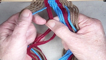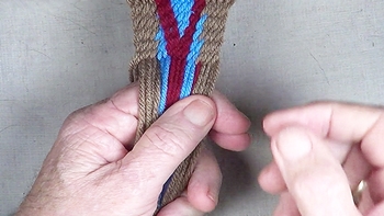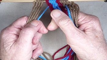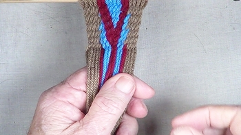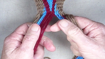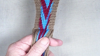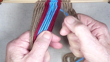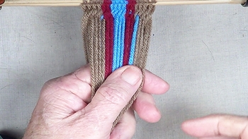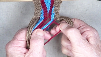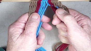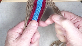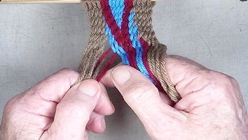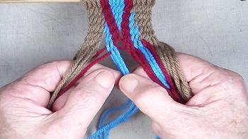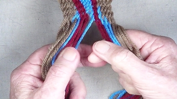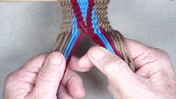 Pass the unused strand of the center color band through the shed of the left hand color band. [NOTE] The left hand color band becomes the left hand [Z] twist twinning strand. |