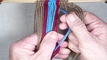 Reach through the the shed of the twinning strands. Pich up the first bottom layer strand of the center color band, Pass the picked up strand through the shed of the twining strands. |
