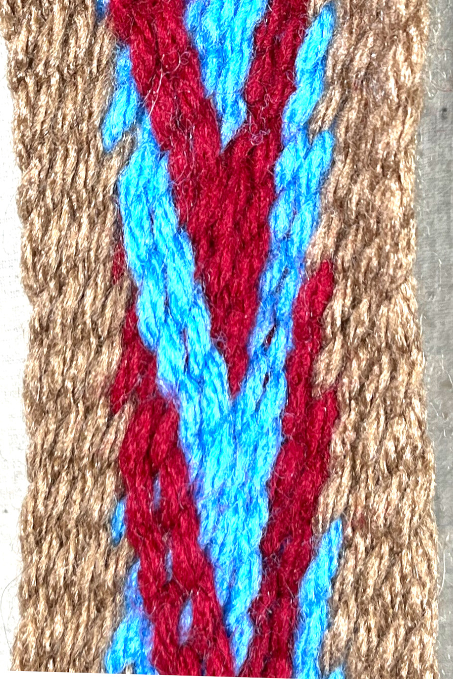 The interlinked chevron pattern is produce by combining two diagonal patterns. One diagonal pattern has a right to left slant; the other diagonal pattern has a left to right slant. The two diagonal slants can be combined to produce a point up chevron or a point down chevron. Also, the chevrons can be produced by [Z] or [S] twist interlinked fingerweaving. |