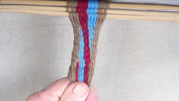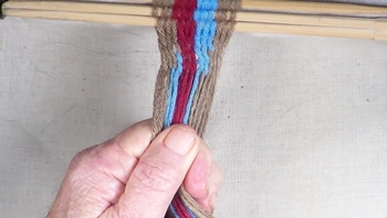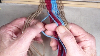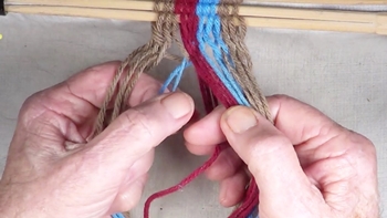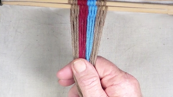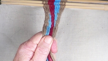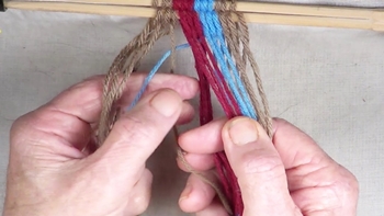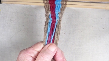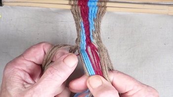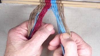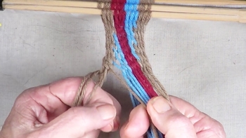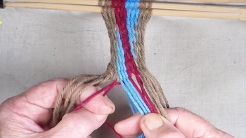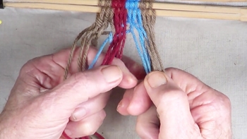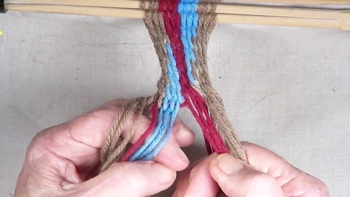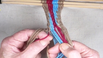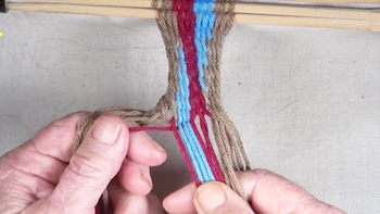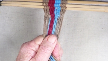Reach through the shed of the twinning strands and pick up the first bottom strand of the right hand color band. Pass the picked up strand through the shed of the twining strands. |