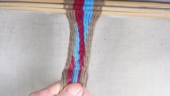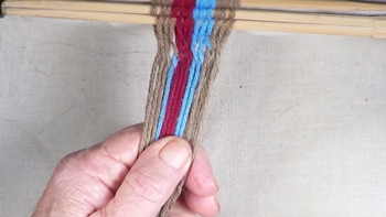 Weave the second pass of the third section of the [S] twist interlinked diagonal pattern. [OBSERVE] The color band strands have been returned to the original configuration. Continue adding additional passes of [S] twist interlinked fingerwewaving until the workpiece has reached the desired length. |