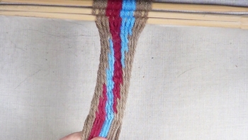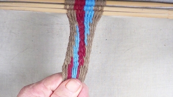 Start on the left hand side of the workpiece, weave [S] twist interlink fingerweaving until one strand of the border color band is unused. |