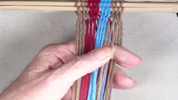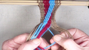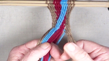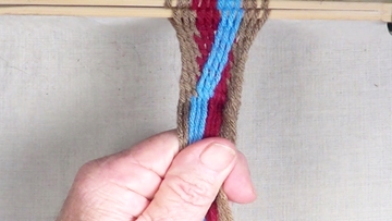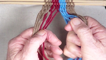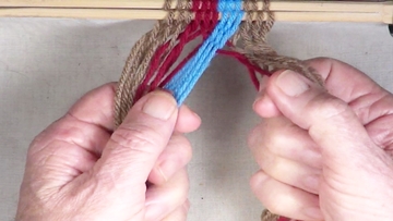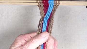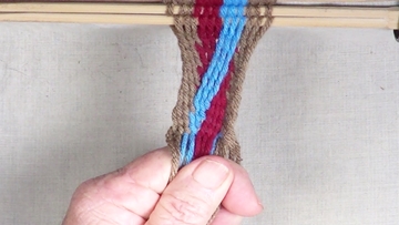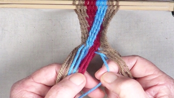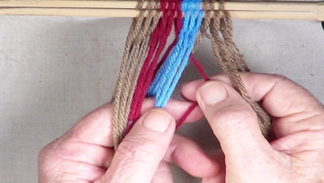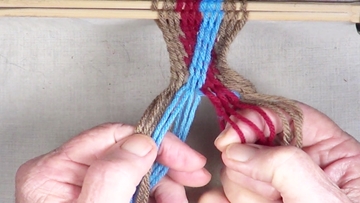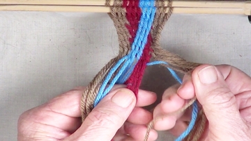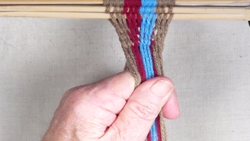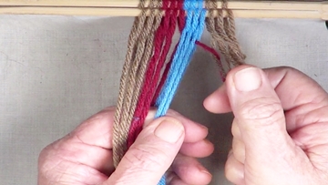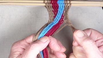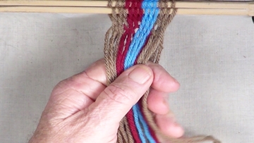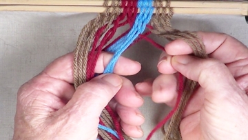 [NOTE] the next color band is used as the twining accent strrands. Reach through the shed of the twinning strands and pick up next top strand. |