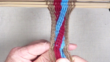Weave the second pass of the third section of the interlinked diagonal pattern. [OBSERVE] The color band strands have been returned to the original configuration. Continue adding additional passes of interlinked fingerwewaving until the workpiece has reached the desired length. |