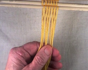 The number of strands determines the width of the workpiece. When a strand reaches the edge of the workpiece it is turned back into the workpiece on the opposite diagonal and and shed layer. If the strand is in the bottom shed layer it will turn up when it reaches the edge of the workpiece. If the strand is in the top shed layer the strand will turn down when it reaches the edge of the workpiece. When a project requires the edges of two elements to be joined, the direction that the strands turn when they reach edge of the workpiece must be planned. If there is an even number of strands, the strands will turn in opposite directions when they reach the edges of the work piece. If there is an odd number of strands, the strands will turn in the same direction when they reach the edges of the work piece. [NOTE] For these tutorials only even numbered strands will be used. |