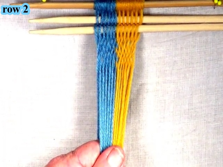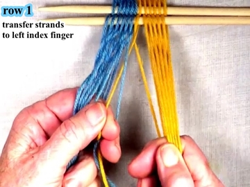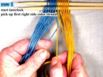 • Pick up the first top layer yarn strand of the right hand color band.