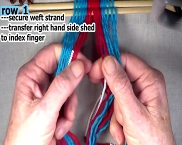 Secure the weft strand. Transfer the right hand side shed to the right hand index finger. |