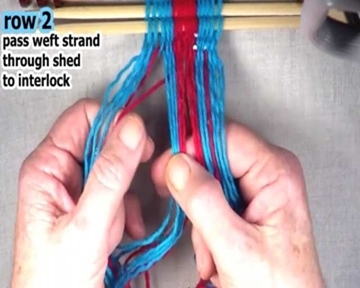 Pass the row 2 left hand side weft strand through the open shed to the interlock in row 1. |