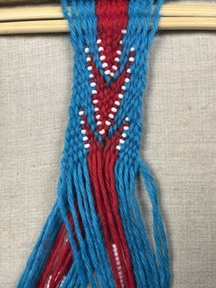 The warp strand that is to the right of the middle is in the top layer of the shed. There are four arrowhead colored warp strands that are bead carrier strands.The two middle warp strands and the two side warp strands. |