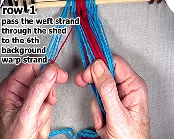 Place the weft strand in the top layer of the shed. The warp strand that was the 6th background warp strand becomes the next segment of the row 1 left side weft strand. |