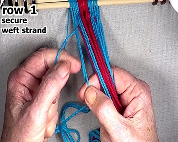 | Secure the row 1 left hand side weft strand. |