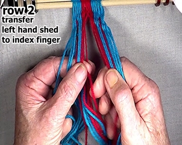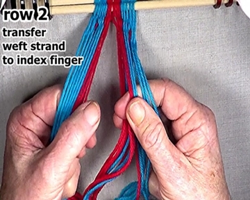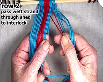 Pass the row 2 left hand side weft strand through the open shed to the row 1 interlock.