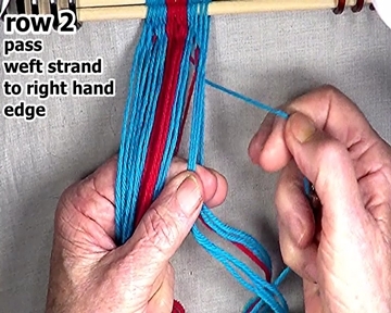 Pass the row 2 left weft strand through the shed to the left hand edge of the work-piece.