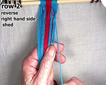 | Pass the row 2 weft strand through the shed to the right hand edge of the work-piece. |
