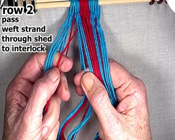 | Pass the row 2 left hand side weft strand through the open shed to the interlock in row 1. |