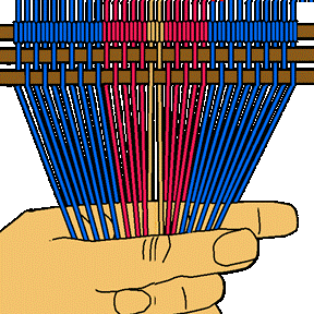 Work from the middle of the shed to left hand edge of the work-piece. [NOTE] make sure that the over/under configuration is maintained. Keep the warp strands parallel. |