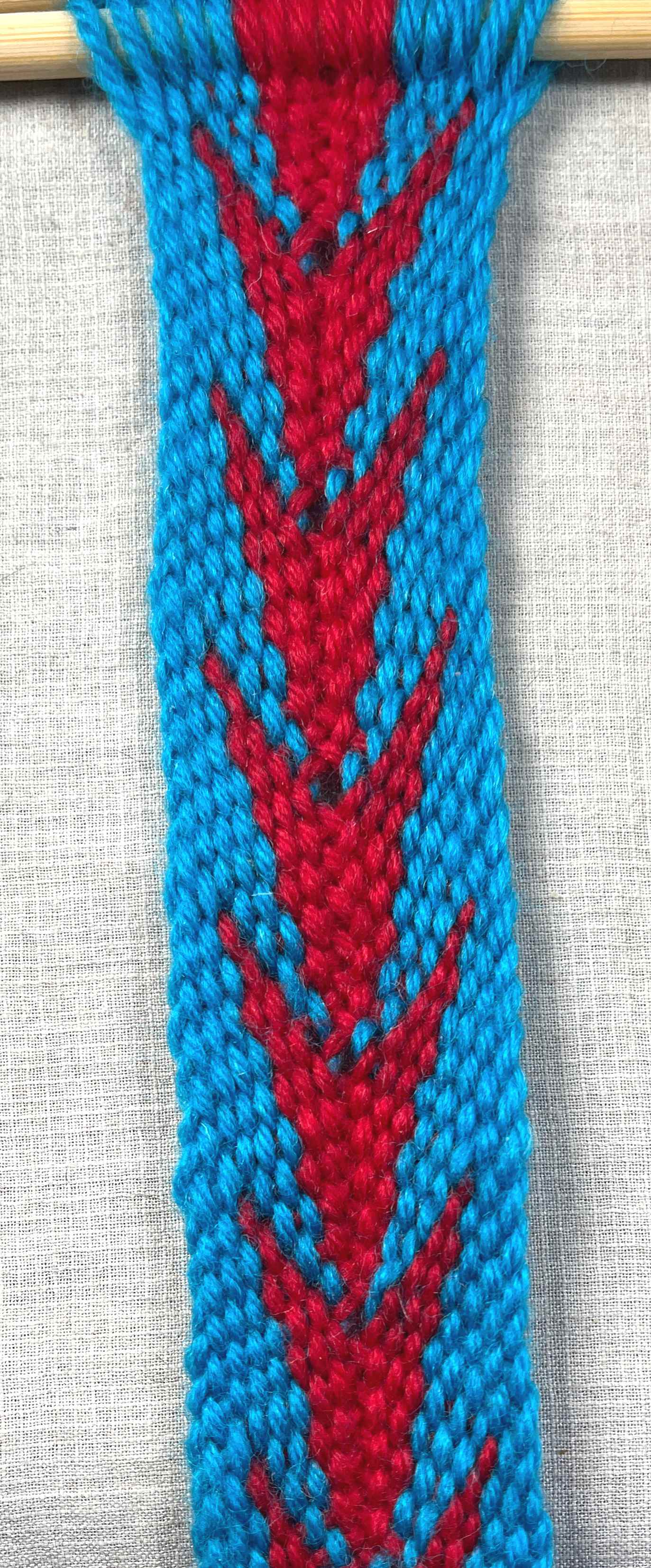 This part of the tutorial will present the steps for weaving the “point down” arrowhead pattern when the warp strand that is to the right of the middle of the work-piece is in the top layer of the shed.