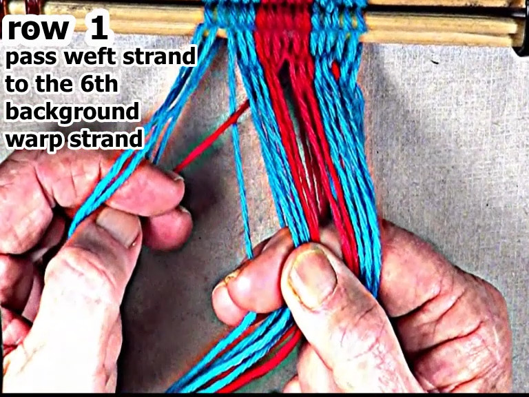 Place the weft strand in the bottom layer of the shed. The warp strand that was the 6th background warp strand becomes the next segment of the row 1 left side weft strand. |