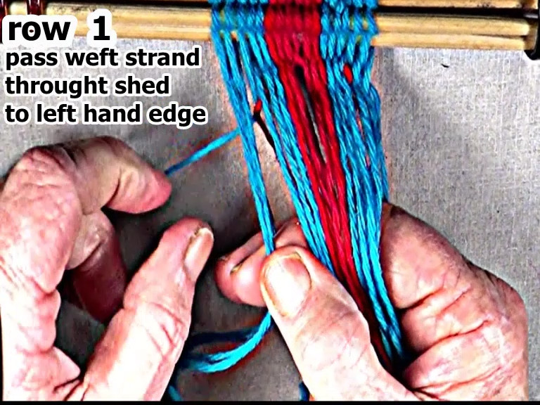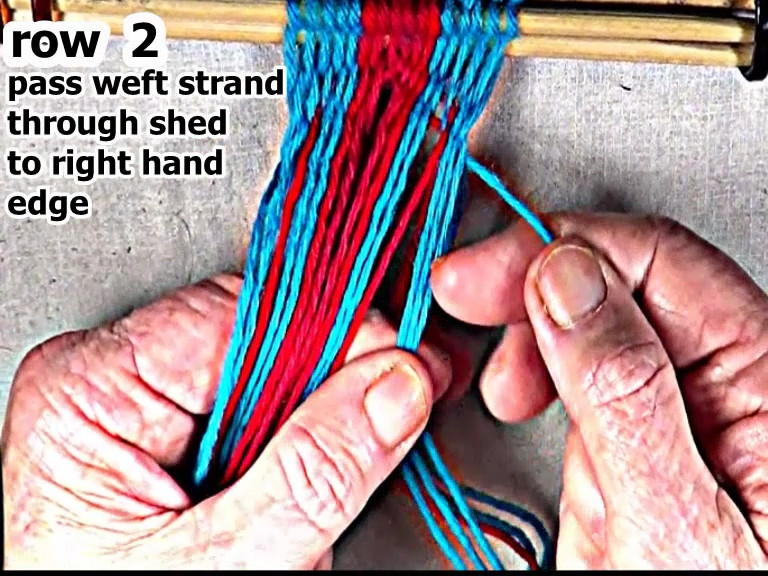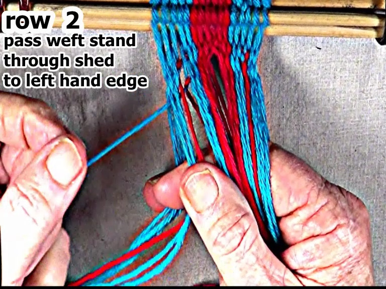 Pass the row 2 left weft strand through the shed to the left hand edge of the work-piece.