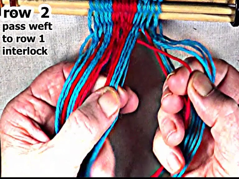 Pass the row 2 left side side weft strand through the open shed to the row 1 interlock.