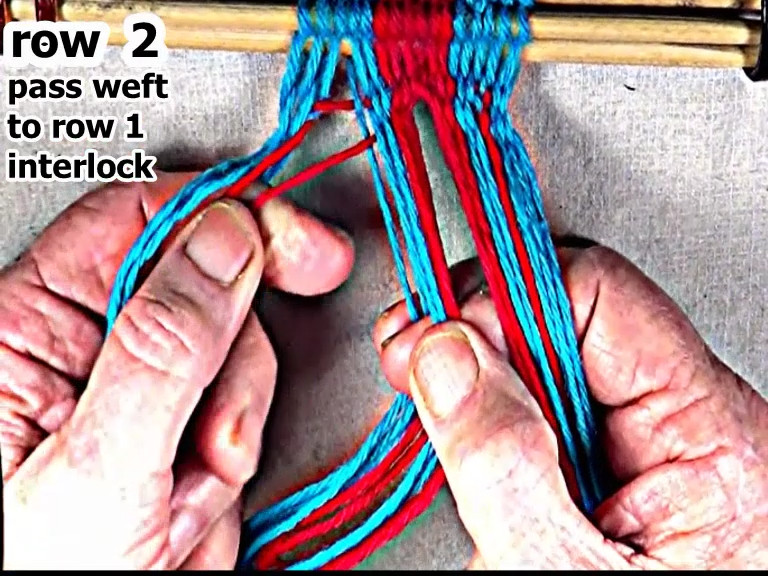 | Pass the row 2 left hand side weft strand through the open shed to the interlock in row 1. |