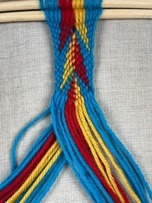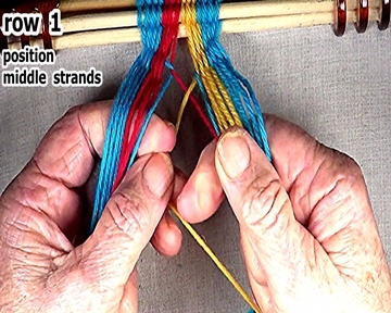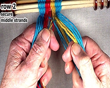 Secure the left middle warp strand by placing the right middle warp strand in the bottom layer of the shed. Check to see if the over/under configuration is maintained. |