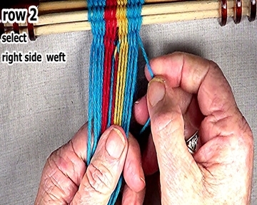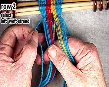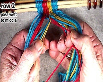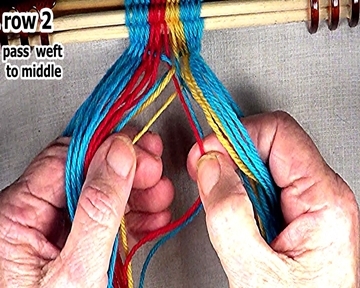 Work from the righ hand edge to the middle of the shed. The right hand row 2 weft strand becomes the left side middle warp strand. |