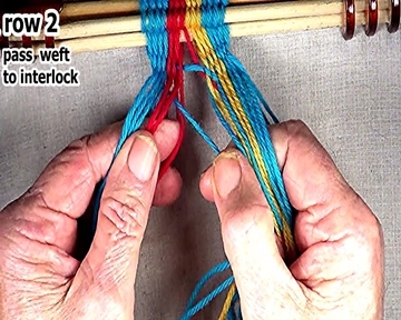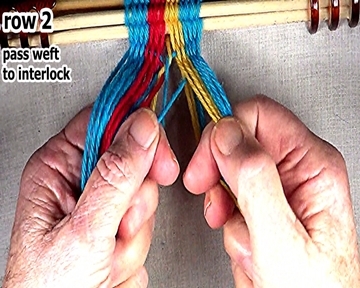 Pass the row 2 weft strand through the open shed to the row 1 right side weft strand interlock. |