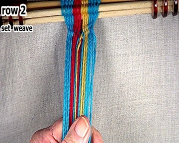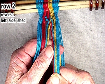 The row 2 weft strand becomes the left middle warp strand when it is placed in the top layer of the shed. |