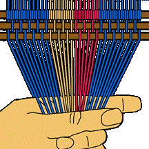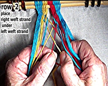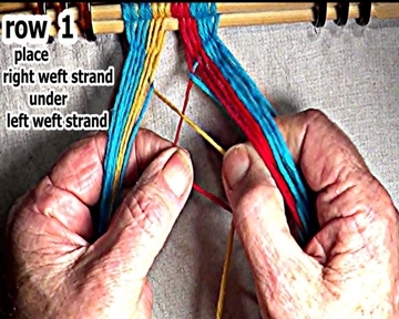 Place the right side weft strand under the left side weft strand. [OBSERVE]At this point the right side weft strand is under two strands.