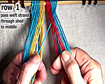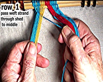 Pass the left side row 1 weft strand throught the open shed to the middle. |