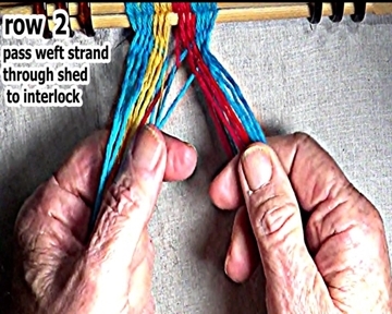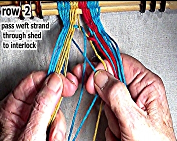 Pass the row 2 right side weft strand through the open shed to the row 1 right side weft strand interlock. |