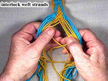 The interlocked weft strands become the first pair of weft strands of the point down chevron part of the the diamond pattern.