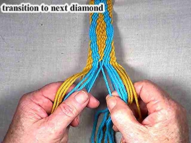 Transtion to the next diamond pattern by crossing the two center warp strands.