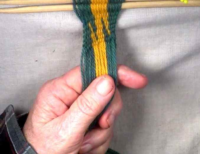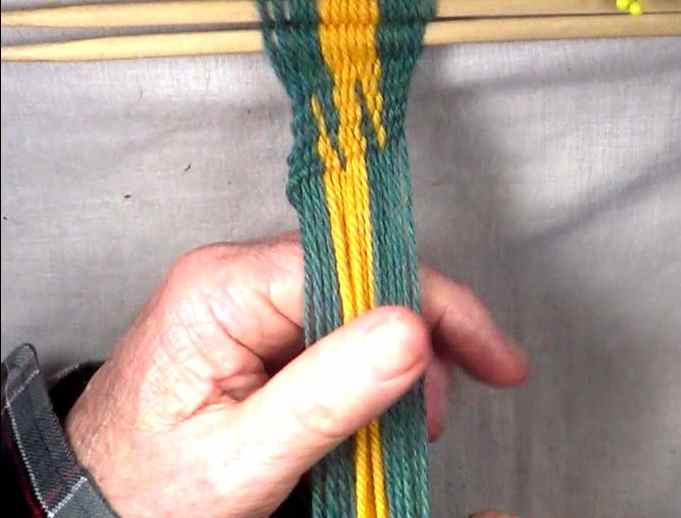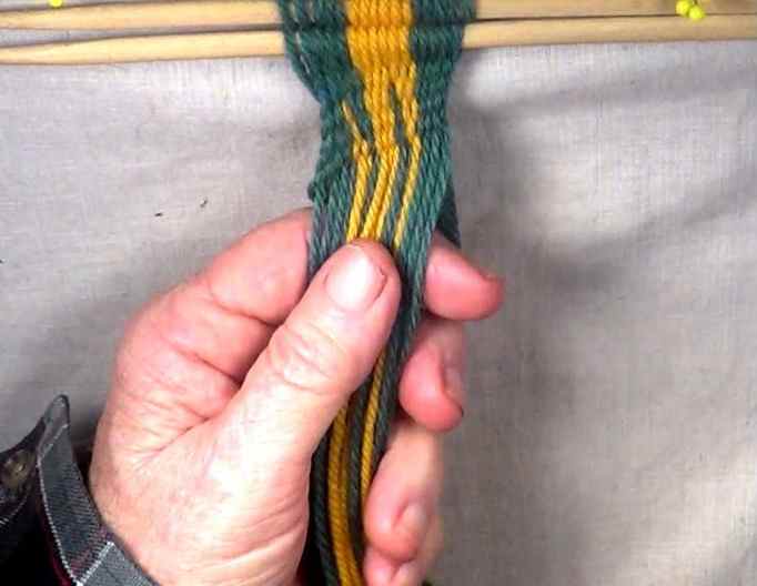 [OBSERVE] The [part 2] weft strand is folded down over the sixth background color warp strand. |