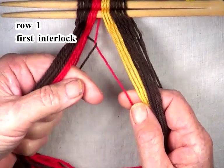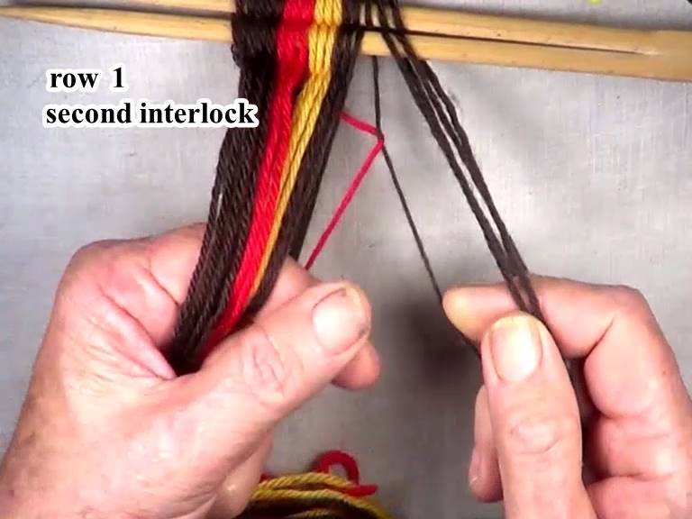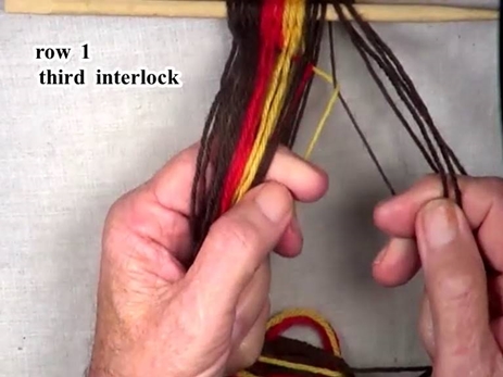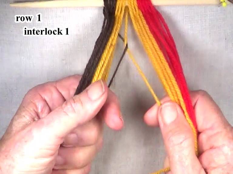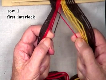 Start the first row 1 interlock by folding the first part of the weft strand up over the sixth lightning color warp strand.
