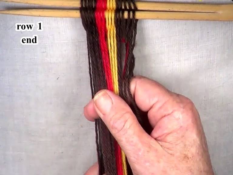 This completes row one. This also sets the location of the weft strand interlocks in the following rows of the lightning pattern.